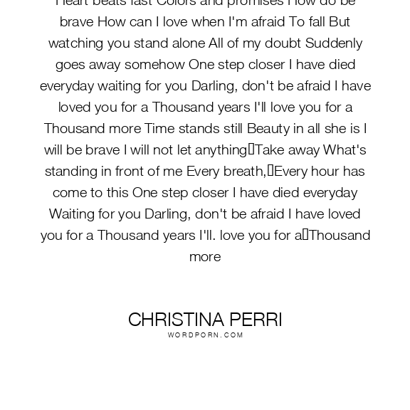 Heart beats fast Colors and promises How do be brave How can I love when I'm afraid To fall But watching you stand alone All of my doubt Suddenly goes away somehow One step closer I have died everyday waiting for you Darling, don't be afraid I have loved you for a Thousand years I'll love you for a Thousand more Time stands still Beauty in all she is I will be brave I will not let anything Take away What's standing in front of me Every breath, Every hour has come to this One step closer I have died everyday Waiting for you Darling, don't be afraid I have loved you for a Thousand years I'll. love you for a Thousand more