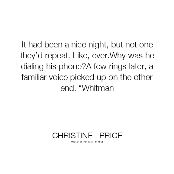 It had been a nice night, but not one they’d repeat. Like, ever.Why was he dialing his phone?A few rings later, a familiar voice picked up on the other end. “Whitman
