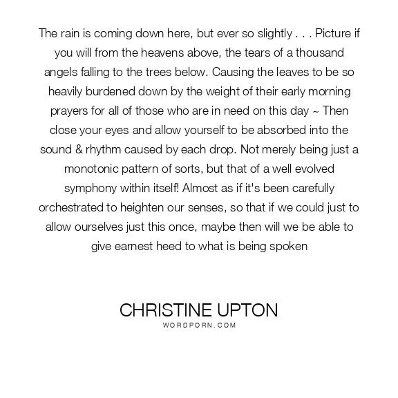 The rain is coming down here, but ever so slightly . . . Picture if you will from the heavens above, the tears of a thousand angels falling to the trees below. Causing the leaves to be so heavily burdened down by the weight of their early morning prayers for all of those who are in need on this day ~ Then close your eyes and allow yourself to be absorbed into the sound & rhythm caused by each drop. Not merely being just a monotonic pattern of sorts, but that of a well evolved symphony within itself! Almost as if it's been carefully orchestrated to heighten our senses, so that if we could just to allow ourselves just this once, maybe then will we be able to give earnest heed to what is being spoken