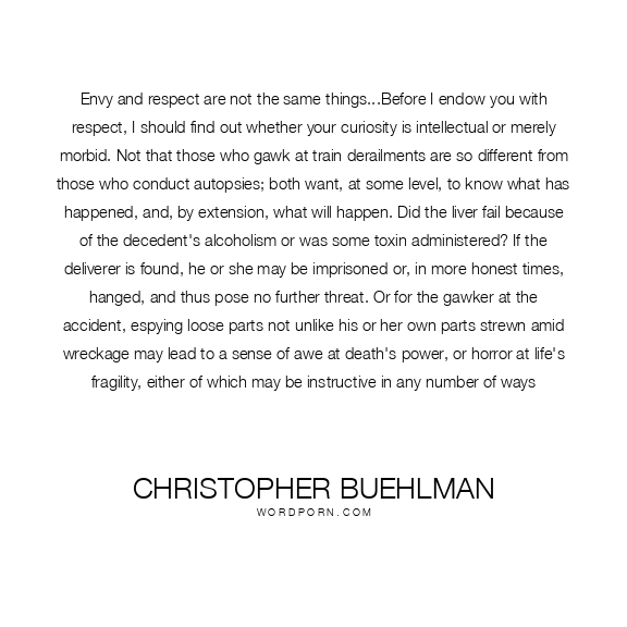 Envy and respect are not the same things...Before I endow you with respect, I should find out whether your curiosity is intellectual or merely morbid. Not that those who gawk at train derailments are so different from those who conduct autopsies; both want, at some level, to know what has happened, and, by extension, what will happen. Did the liver fail because of the decedent's alcoholism or was some toxin administered? If the deliverer is found, he or she may be imprisoned or, in more honest times, hanged, and thus pose no further threat. Or for the gawker at the accident, espying loose parts not unlike his or her own parts strewn amid wreckage may lead to a sense of awe at death's power, or horror at life's fragility, either of which may be instructive in any number of ways