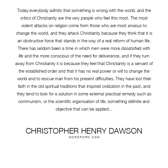 Today everybody admits that something is wrong with the world, and the critics of Christianity are the very people who feel this most. The most violent attacks on religion come from those who are most anxious to change the world, and they attack Christianity because they think that it is an obstructive force that stands in the way of a real reform of human life. There has seldom been a time in which men were more dissatisfied with life and the more conscious of the need for deliverance, and if they turn away from Christianity it is because they feel that Christianity is a servant of the established order and that it has no real power or will to change the world and to rescue man from his present difficulties. They have lost their faith in the old spiritual traditions that inspired civilization in the past, and they tend to look for a solution in some external practical remedy such as communism, or the scientific organisation of life; something definite and objective that can be applied to society as a whole