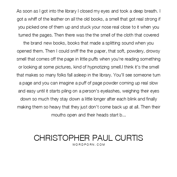 As soon as I got into the library I closed my eyes and took a deep breath. I got a whiff of the leather on all the old books, a smell that got real strong if you picked one of them up and stuck your nose real close to it when you turned the pages. Then there was the the smell of the cloth that covered the brand-new books, books that made a splitting sound when you opened them. Then I could sniff the the paper, that soft, powdery, drowsy smell that comes off the page in little puffs when you're reading something or looking at some pictures, kind of hypnotizing smell.I think it's the smell that makes so many folks fall asleep in the library. You'll see someone turn a page and you can imagine a puff of page powder coming up real slow and easy until it starts piling on a person's eyelashes, weighing their eyes down so much they stay down a little longer after each blink and finally making them so heavy that they just don't come back up at all. Then their mouths open and their heads start bouncing up and down like they're bobbing in a big tub of of water for apples and before you know it... they're out cold and their face thunks smack-dab on the book.That's the part that makes librarians the maddest. They get real upset if folks start drooling in the books
