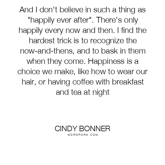 And I don't believe in such a thing as "happily ever after". There's only happily every now and then. I find the hardest trick is to recognize the now-and-thens, and to bask in them when they come. Happiness is a choice we make, like how to wear our hair, or having coffee with breakfast and tea at night
