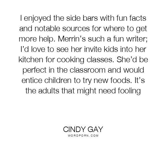 I enjoyed the side bars with fun facts and notable sources for where to get more help. Merrin’s such a fun writer; I’d love to see her invite kids into her kitchen for cooking classes. She’d be perfect in the classroom and would entice children to try new foods. It’s the adults that might need fooling