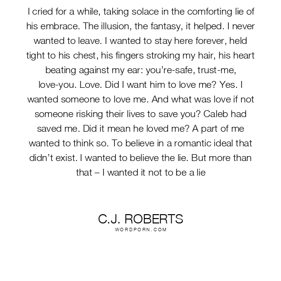 I cried for a while, taking solace in the comforting lie of his embrace. The illusion, the fantasy, it helped. I never wanted to leave. I wanted to stay here forever, held tight to his chest, his fingers stroking my hair, his heart beating against my ear: you’re-safe, trust-me, love-you. Love. Did I want him to love me? Yes. I wanted someone to love me. And what was love if not someone risking their lives to save you? Caleb had saved me. Did it mean he loved me? A part of me wanted to think so. To believe in a romantic ideal that didn’t exist. I wanted to believe the lie. But more than that – I wanted it not to be a lie