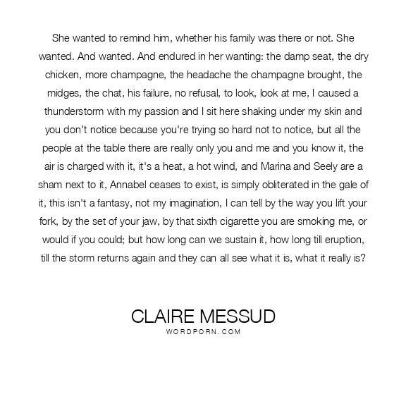 She wanted to remind him, whether his family was there or not. She wanted. And wanted. And endured in her wanting: the damp seat, the dry chicken, more champagne, the headache the champagne brought, the midges, the chat, his failure, no refusal, to look, look at me, I caused a thunderstorm with my passion and I sit here shaking under my skin and you don't notice because you're trying so hard not to notice, but all the people at the table there are really only you and me and you know it, the air is charged with it, it's a heat, a hot wind, and Marina and Seely are a sham next to it, Annabel ceases to exist, is simply obliterated in the gale of it, this isn't a fantasy, not my imagination, I can tell by the way you lift your fork, by the set of your jaw, by that sixth cigarette you are smoking me, or would if you could; but how long can we sustain it, how long till eruption, till the storm returns again and they can all see what it is, what it really is?