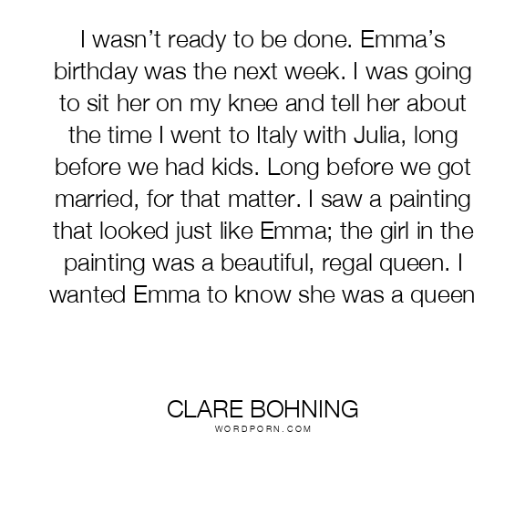 I wasn’t ready to be done. Emma’s birthday was the next week. I was going to sit her on my knee and tell her about the time I went to Italy with Julia, long before we had kids. Long before we got married, for that matter. I saw a painting that looked just like Emma; the girl in the painting was a beautiful, regal queen. I wanted Emma to know she was a queen