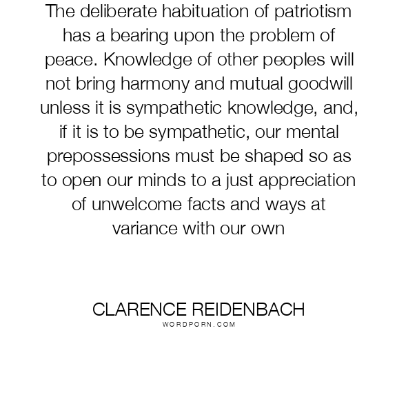 The deliberate habituation of patriotism has a bearing upon the problem of peace. Knowledge of other peoples will not bring harmony and mutual goodwill unless it is sympathetic knowledge, and, if it is to be sympathetic, our mental prepossessions must be shaped so as to open our minds to a just appreciation of unwelcome facts and ways at variance with our own