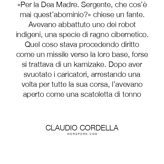 «Per la Dea Madre. Sergente, che cos’è mai quest’abominio?» chiese un fante. Avevano abbattuto uno dei robot indigeni, una specie di ragno cibernetico. Quel coso stava procedendo diritto come un missile verso la loro base, forse si trattava di un kamizake. Dopo aver svuotato i caricatori, arrestando una volta per tutte la sua corsa, l’avevano aperto come una scatoletta di tonno