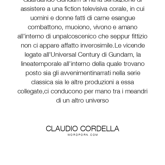Guardando Gundam si ha la sensazione di assistere a una fiction televisiva corale, in cui uomini e donne fatti di carne esangue combattono, muoiono, vivono e amano all'interno di unpalcoscenico che seppur fittizio non ci appare affatto inverosimile.Le vicende legate all'Universal Century di Gundam, la lineatemporale all'interno della quale trovano posto sia gli avvenimentinarrati nella serie classica sia le altre produzioni a essa collegate,ci conducono per mano tra i meandri di un altro universo