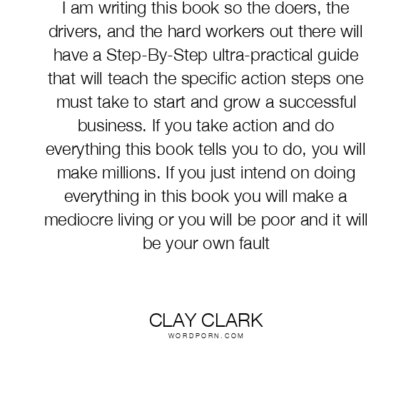 I am writing this book so the doers, the drivers, and the hard workers out there will have a Step-By-Step ultra-practical guide that will teach the specific action steps one must take to start and grow a successful business. If you take action and do everything this book tells you to do, you will make millions. If you just intend on doing everything in this book you will make a mediocre living or you will be poor and it will be your own fault