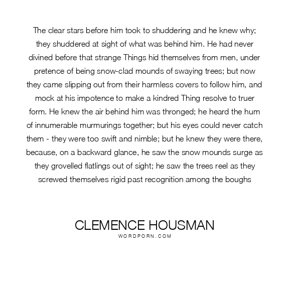The clear stars before him took to shuddering and he knew why; they shuddered at sight of what was behind him. He had never divined before that strange Things hid themselves from men, under pretence of being snow-clad mounds of swaying trees; but now they came slipping out from their harmless covers to follow him, and mock at his impotence to make a kindred Thing resolve to truer form. He knew the air behind him was thronged; he heard the hum of innumerable murmurings together; but his eyes could never catch them - they were too swift and nimble; but he knew they were there, because, on a backward glance, he saw the snow mounds surge as they grovelled flatlings out of sight; he saw the trees reel as they screwed themselves rigid past recognition among the boughs