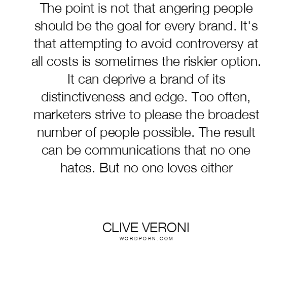 The point is not that angering people should be the goal for every brand. It's that attempting to avoid controversy at all costs is sometimes the riskier option. It can deprive a brand of its distinctiveness and edge. Too often, marketers strive to please the broadest number of people possible. The result can be communications that no one hates. But no one loves either