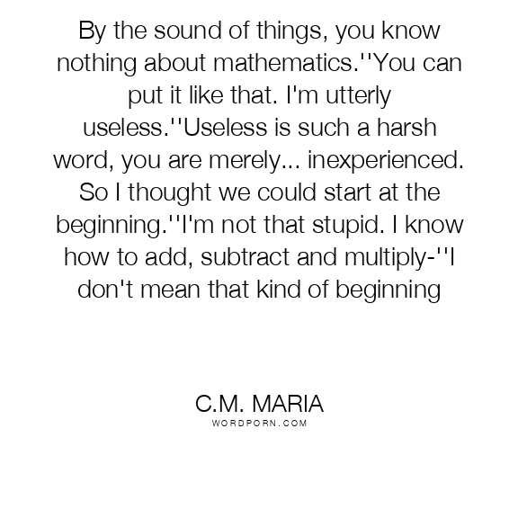 By the sound of things, you know nothing about mathematics.''You can put it like that. I'm utterly useless.''Useless is such a harsh word, you are merely... inexperienced. So I thought we could start at the beginning.''I'm not that stupid. I know how to add, subtract and multiply-''I don't mean that kind of beginning