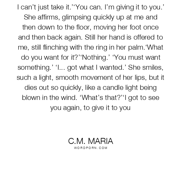 I can’t just take it.’‘You can. I’m giving it to you.’ She affirms, glimpsing quickly up at me and then down to the floor, moving her foot once and then back again. Still her hand is offered to me, still flinching with the ring in her palm.‘What do you want for it?’‘Nothing.’ ‘You must want something.’ ‘I... got what I wanted.’ She smiles, such a light, smooth movement of her lips, but it dies out so quickly, like a candle light being blown in the wind. ‘What’s that?’‘I got to see you again, to give it to you