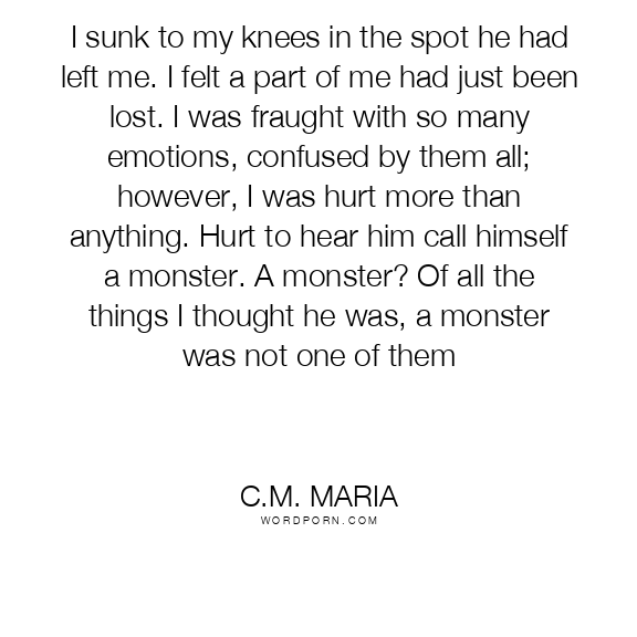 I sunk to my knees in the spot he had left me. I felt a part of me had just been lost. I was fraught with so many emotions, confused by them all; however, I was hurt more than anything. Hurt to hear him call himself a monster. A monster? Of all the things I thought he was, a monster was not one of them