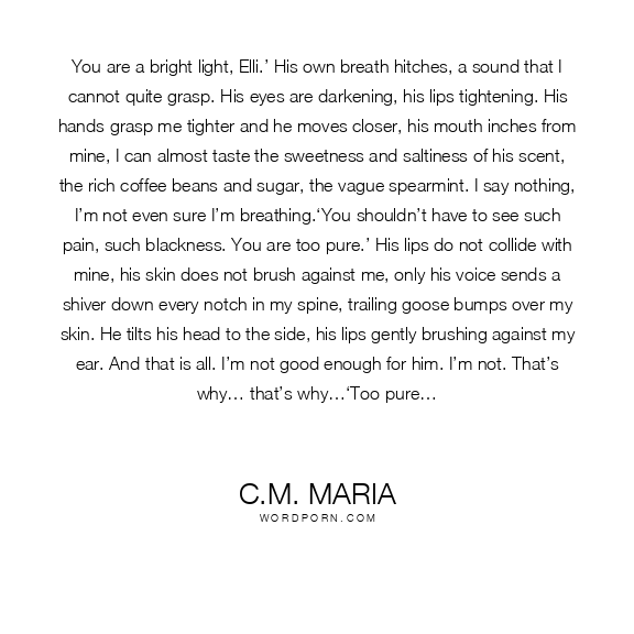 You are a bright light, Elli.’ His own breath hitches, a sound that I cannot quite grasp. His eyes are darkening, his lips tightening. His hands grasp me tighter and he moves closer, his mouth inches from mine, I can almost taste the sweetness and saltiness of his scent, the rich coffee beans and sugar, the vague spearmint. I say nothing, I’m not even sure I’m breathing.‘You shouldn’t have to see such pain, such blackness. You are too pure.’ His lips do not collide with mine, his skin does not brush against me, only his voice sends a shiver down every notch in my spine, trailing goose bumps over my skin. He tilts his head to the side, his lips gently brushing against my ear. And that is all. I’m not good enough for him. I’m not. That’s why… that’s why…‘Too pure…