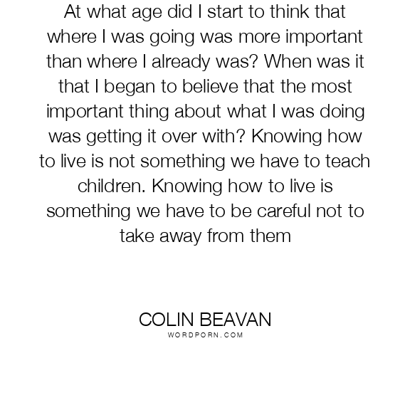 At what age did I start to think that where I was going was more important than where I already was? When was it that I began to believe that the most important thing about what I was doing was getting it over with? Knowing how to live is not something we have to teach children. Knowing how to live is something we have to be careful not to take away from them