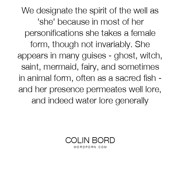 We designate the spirit of the well as 'she' because in most of her personifications she takes a female form, though not invariably. She appears in many guises - ghost, witch, saint, mermaid, fairy, and sometimes in animal form, often as a sacred fish - and her presence permeates well lore, and indeed water lore generally