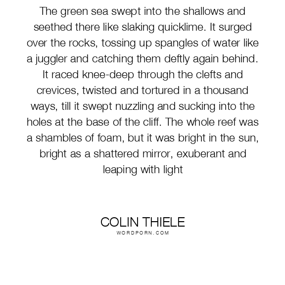 The green sea swept into the shallows and seethed there like slaking quicklime. It surged over the rocks, tossing up spangles of water like a juggler and catching them deftly again behind. It raced knee-deep through the clefts and crevices, twisted and tortured in a thousand ways, till it swept nuzzling and sucking into the holes at the base of the cliff. The whole reef was a shambles of foam, but it was bright in the sun, bright as a shattered mirror, exuberant and leaping with light