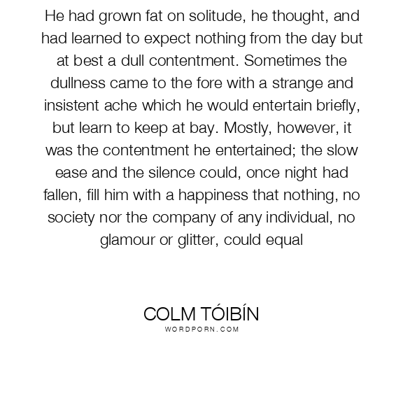He had grown fat on solitude, he thought, and had learned to expect nothing from the day but at best a dull contentment. Sometimes the dullness came to the fore with a strange and insistent ache which he would entertain briefly, but learn to keep at bay. Mostly, however, it was the contentment he entertained; the slow ease and the silence could, once night had fallen, fill him with a happiness that nothing, no society nor the company of any individual, no glamour or glitter, could equal