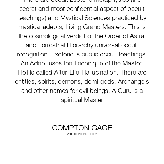 There are occult Esoteric Metaphysics (the secret and most confidential aspect of occult teachings) and Mystical Sciences practiced by mystical adepts, Living Grand Masters. This is the cosmological verdict of the Order of Astral and Terrestrial Hierarchy universal occult recognition. Exoteric is public occult teachings. An Adept uses the Technique of the Master. Hell is called After-Life-Hallucination. There are entities, spirits, demons, demi-gods, Archangels and other names for evil beings. A Guru is a spiritual Master