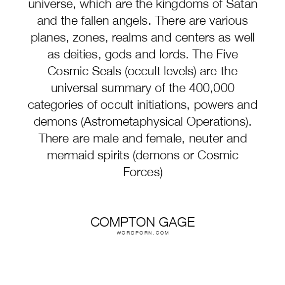 There are seven occult kingdoms in the universe, which are the kingdoms of Satan and the fallen angels. There are various planes, zones, realms and centers as well as deities, gods and lords. The Five Cosmic Seals (occult levels) are the universal summary of the 400,000 categories of occult initiations, powers and demons (Astrometaphysical Operations). There are male and female, neuter and mermaid spirits (demons or Cosmic Forces)