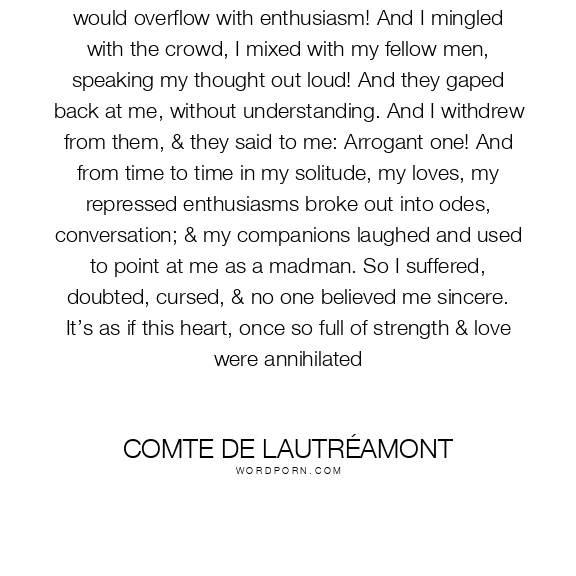 I was a young, & had deep loves, & my heart would overflow with enthusiasm! And I mingled with the crowd, I mixed with my fellow men, speaking my thought out loud! And they gaped back at me, without understanding. And I withdrew from them, & they said to me: Arrogant one! And from time to time in my solitude, my loves, my repressed enthusiasms broke out into odes, conversation; & my companions laughed and used to point at me as a madman. So I suffered, doubted, cursed, & no one believed me sincere. It’s as if this heart, once so full of strength & love were annihilated
