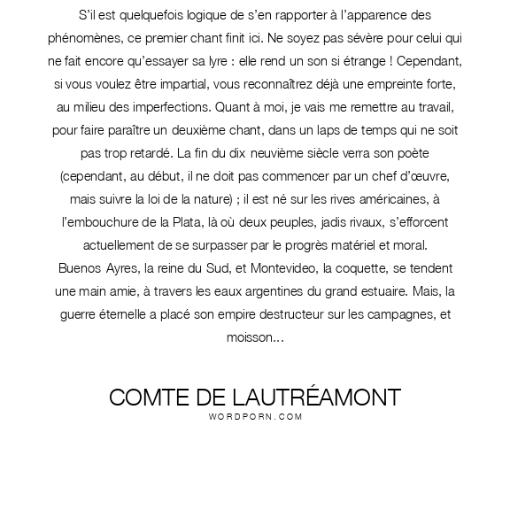 S’il est quelquefois logique de s’en rapporter à l’apparence des phénomènes, ce premier chant finit ici. Ne soyez pas sévère pour celui qui ne fait encore qu’essayer sa lyre : elle rend un son si étrange ! Cependant, si vous voulez être impartial, vous reconnaîtrez déjà une empreinte forte, au milieu des imperfections. Quant à moi, je vais me remettre au travail, pour faire paraître un deuxième chant, dans un laps de temps qui ne soit pas trop retardé. La fin du dix-neuvième siècle verra son poète (cependant, au début, il ne doit pas commencer par un chef d’œuvre, mais suivre la loi de la nature) ; il est né sur les rives américaines, à l’embouchure de la Plata, là où deux peuples, jadis rivaux, s’efforcent actuellement de se surpasser par le progrès matériel et moral. Buenos-Ayres, la reine du Sud, et Montevideo, la coquette, se tendent une main amie, à travers les eaux argentines du grand estuaire. Mais, la guerre éternelle a placé son empire destructeur sur les campagnes, et moissonne avec joie des victimes nombreuses. Adieu, vieillard, et pense à moi, si tu m’as lu. Toi, jeune homme, ne désespère point ; car, tu as un ami dans le vampire, malgré ton opinion contraire. En comptant l’acarus sarcopte qui produit la gale, tu auras deux amis !