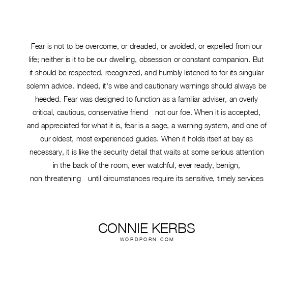 Fear is not to be overcome, or dreaded, or avoided, or expelled from our life; neither is it to be our dwelling, obsession or constant companion. But it should be respected, recognized, and humbly listened to for its singular solemn advice. Indeed, it's wise and cautionary warnings should always be heeded. Fear was designed to function as a familiar adviser, an overly critical, cautious, conservative friend - not our foe. When it is accepted, and appreciated for what it is, fear is a sage, a warning system, and one of our oldest, most experienced guides. When it holds itself at bay as necessary, it is like the security detail that waits at some serious attention in the back of the room, ever watchful, ever ready, benign, non-threatening - until circumstances require its sensitive, timely services