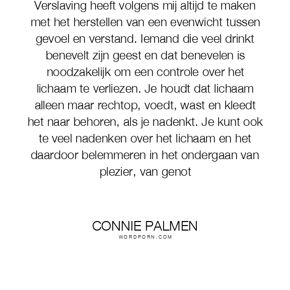 Verslaving heeft volgens mij altijd te maken met het herstellen van een evenwicht tussen gevoel en verstand. Iemand die veel drinkt benevelt zijn geest en dat benevelen is noodzakelijk om een controle over het lichaam te verliezen. Je houdt dat lichaam alleen maar rechtop, voedt, wast en kleedt het naar behoren, als je nadenkt. Je kunt ook te veel nadenken over het lichaam en het daardoor belemmeren in het ondergaan van plezier, van genot