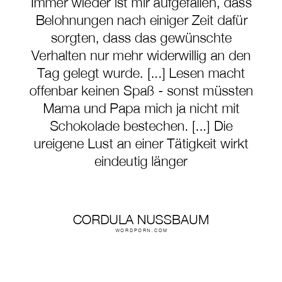 Immer wieder ist mir aufgefallen, dass Belohnungen nach einiger Zeit dafür sorgten, dass das gewünschte Verhalten nur mehr widerwillig an den Tag gelegt wurde. [...] Lesen macht offenbar keinen Spaß - sonst müssten Mama und Papa mich ja nicht mit Schokolade bestechen. [...] Die ureigene Lust an einer Tätigkeit wirkt eindeutig länger