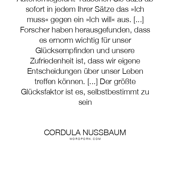 Stärken Sie immer wieder Ihr Autonomiegefühl. Tauschen Sie dazu ab sofort in jedem Ihrer Sätze das »Ich muss« gegen ein »Ich will« aus. [...] Forscher haben herausgefunden, dass es ernorm wichtig für unser Glücksempfinden und unsere Zufriedenheit ist, dass wir eigene Entscheidungen über unser Leben treffen können. [...] Der größte Glücksfaktor ist es, selbstbestimmt zu sein