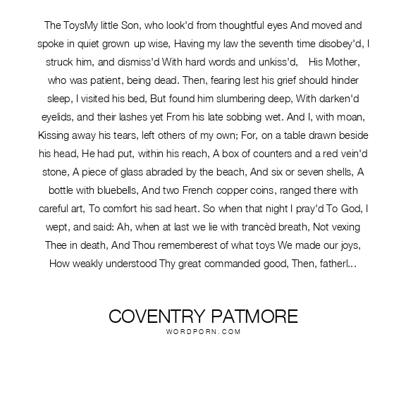 The ToysMy little Son, who look'd from thoughtful eyes And moved and spoke in quiet grown-up wise, Having my law the seventh time disobey'd, I struck him, and dismiss'd With hard words and unkiss'd,—His Mother, who was patient, being dead. Then, fearing lest his grief should hinder sleep, I visited his bed, But found him slumbering deep, With darken'd eyelids, and their lashes yet From his late sobbing wet. And I, with moan, Kissing away his tears, left others of my own; For, on a table drawn beside his head, He had put, within his reach, A box of counters and a red-vein'd stone, A piece of glass abraded by the beach, And six or seven shells, A bottle with bluebells, And two French copper coins, ranged there with careful art, To comfort his sad heart. So when that night I pray'd To God, I wept, and said: Ah, when at last we lie with trancèd breath, Not vexing Thee in death, And Thou rememberest of what toys We made our joys, How weakly understood Thy great commanded good, Then, fatherly not less Than I whom Thou hast moulded from the clay, Thou'lt leave Thy wrath, and say, 'I will be sorry for their childishness