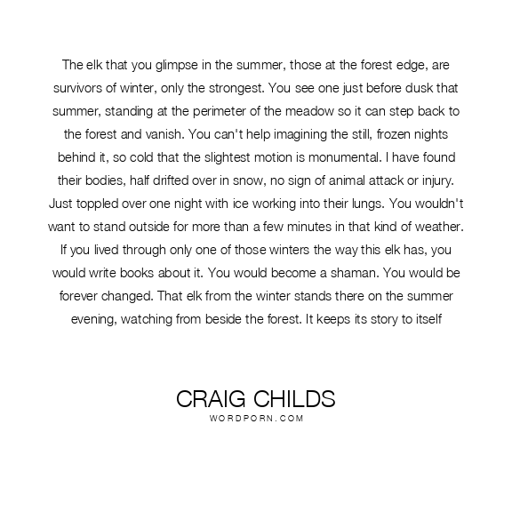 The elk that you glimpse in the summer, those at the forest edge, are survivors of winter, only the strongest. You see one just before dusk that summer, standing at the perimeter of the meadow so it can step back to the forest and vanish. You can't help imagining the still, frozen nights behind it, so cold that the slightest motion is monumental. I have found their bodies, half drifted over in snow, no sign of animal attack or injury. Just toppled over one night with ice working into their lungs. You wouldn't want to stand outside for more than a few minutes in that kind of weather. If you lived through only one of those winters the way this elk has, you would write books about it. You would become a shaman. You would be forever changed. That elk from the winter stands there on the summer evening, watching from beside the forest. It keeps its story to itself