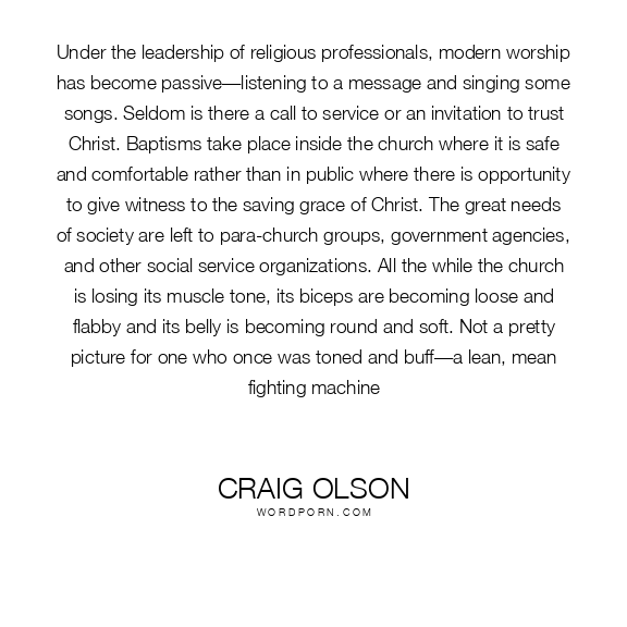 Under the leadership of religious professionals, modern worship has become passive—listening to a message and singing some songs. Seldom is there a call to service or an invitation to trust Christ. Baptisms take place inside the church where it is safe and comfortable rather than in public where there is opportunity to give witness to the saving grace of Christ. The great needs of society are left to para-church groups, government agencies, and other social service organizations. All the while the church is losing its muscle tone, its biceps are becoming loose and flabby and its belly is becoming round and soft. Not a pretty picture for one who once was toned and buff—a lean, mean fighting machine