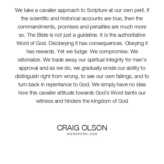 We take a cavalier approach to Scripture at our own peril. If the scientific and historical accounts are true, then the commandments, promises and penalties are much more so. The Bible is not just a guideline. It is the authoritative Word of God. Disobeying it has consequences. Obeying it has rewards. Yet we fudge. We compromise. We rationalize. We trade away our spiritual integrity for man’s approval and as we do, we gradually erode our ability to distinguish right from wrong, to see our own failings, and to turn back in repentance to God. We simply have no idea how this cavalier attitude towards God’s Word taints our witness and hinders the kingdom of God