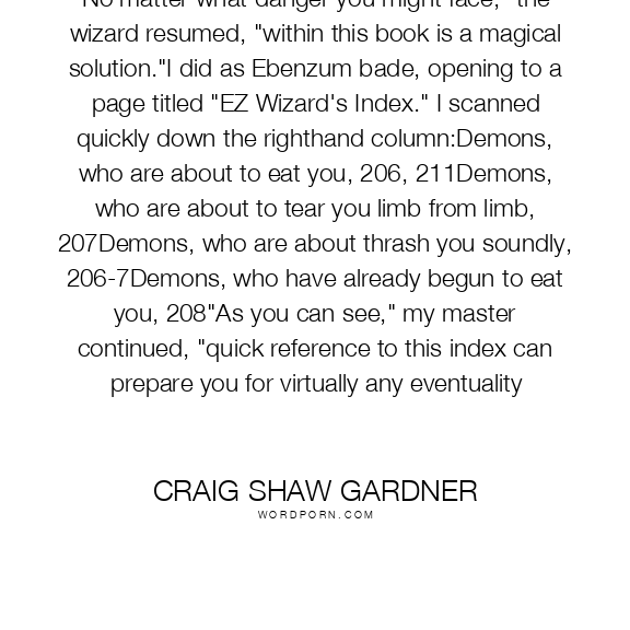 No matter what danger you might face," the wizard resumed, "within this book is a magical solution."I did as Ebenzum bade, opening to a page titled "EZ Wizard's Index." I scanned quickly down the righthand column:Demons, who are about to eat you, 206, 211Demons, who are about to tear you limb from limb, 207Demons, who are about thrash you soundly, 206-7Demons, who have already begun to eat you, 208"As you can see," my master continued, "quick reference to this index can prepare you for virtually any eventuality