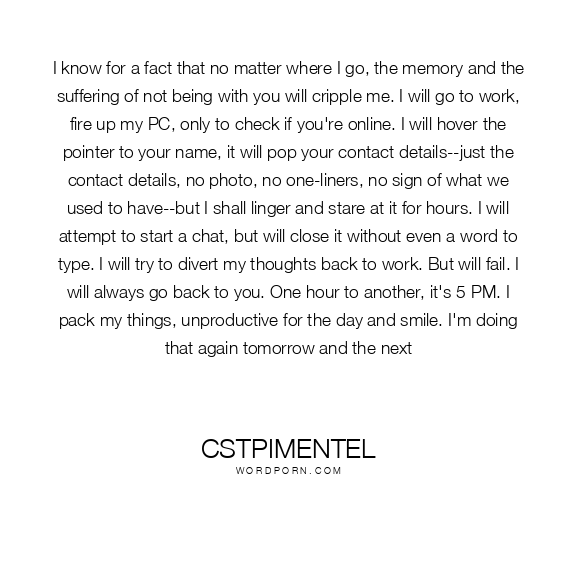 I know for a fact that no matter where I go, the memory and the suffering of not being with you will cripple me. I will go to work, fire up my PC, only to check if you're online. I will hover the pointer to your name, it will pop your contact details--just the contact details, no photo, no one-liners, no sign of what we used to have--but I shall linger and stare at it for hours. I will attempt to start a chat, but will close it without even a word to type. I will try to divert my thoughts back to work. But will fail. I will always go back to you. One hour to another, it's 5 PM. I pack my things, unproductive for the day and smile. I'm doing that again tomorrow and the next