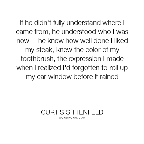 if he didn't fully understand where I came from, he understood who I was now -- he knew how well done I liked my steak, knew the color of my toothbrush, the expression I made when I realized I'd forgotten to roll up my car window before it rained