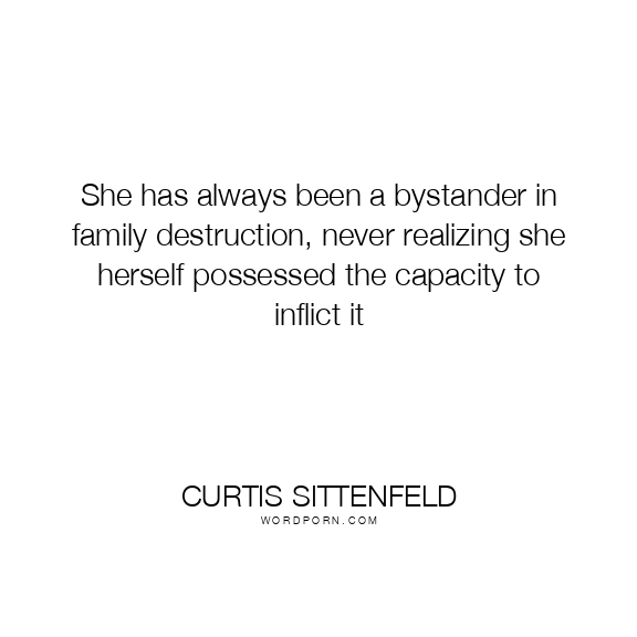 She has always been a bystander in family destruction, never realizing she herself possessed the capacity to inflict it