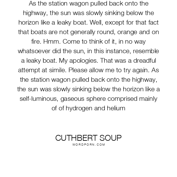 As the station wagon pulled back onto the highway, the sun was slowly sinking below the horizon like a leaky boat. Well, except for that fact that boats are not generally round, orange and on fire. Hmm. Come to think of it, in no way whatsoever did the sun, in this instance, resemble a leaky boat. My apologies. That was a dreadful attempt at simile. Please allow me to try again. As the station wagon pulled back onto the highway, the sun was slowly sinking below the horizon like a self-luminous, gaseous sphere comprised mainly of of hydrogen and helium