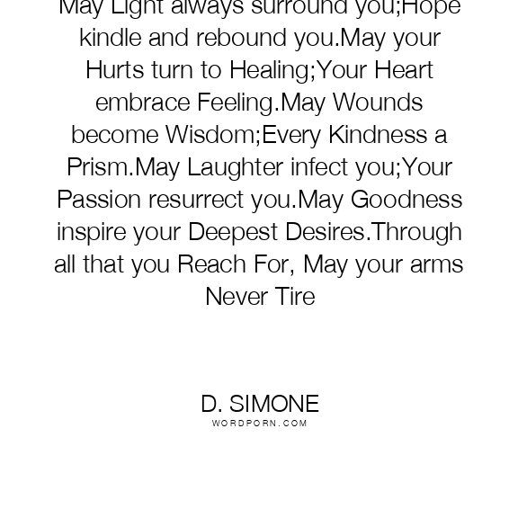 May Light always surround you;Hope kindle and rebound you.May your Hurts turn to Healing;Your Heart embrace Feeling.May Wounds become Wisdom;Every Kindness a Prism.May Laughter infect you;Your Passion resurrect you.May Goodness inspire your Deepest Desires.Through all that you Reach For, May your arms Never Tire