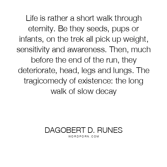 Life is rather a short walk through eternity. Be they seeds, pups or infants, on the trek all pick up weight, sensitivity and awareness. Then, much before the end of the run, they deteriorate, head, legs and lungs. The tragicomedy of existence: the long walk of slow decay