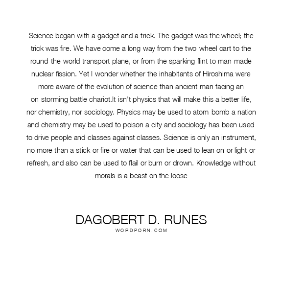 Science began with a gadget and a trick. The gadget was the wheel; the trick was fire. We have come a long way from the two-wheel cart to the round-the-world transport plane, or from the sparking flint to man-made nuclear fission. Yet I wonder whether the inhabitants of Hiroshima were more aware of the evolution of science than ancient man facing an on-storming battle chariot.It isn't physics that will make this a better life, nor chemistry, nor sociology. Physics may be used to atom-bomb a nation and chemistry may be used to poison a city and sociology has been used to drive people and classes against classes. Science is only an instrument, no more than a stick or fire or water that can be used to lean on or light or refresh, and also can be used to flail or burn or drown. Knowledge without morals is a beast on the loose