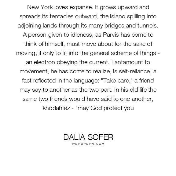 New York loves expanse. It grows upward and spreads its tentacles outward, the island spilling into adjoining lands through its many bridges and tunnels. A person given to idleness, as Parvis has come to think of himself, must move about for the sake of moving, if only to fit into the general scheme of things - an electron obeying the current. Tantamount to movement, he has come to realize, is self-reliance, a fact reflected in the language: "Take care," a friend may say to another as the two part. In his old life the same two friends would have said to one another, khodahfez - "may God protect you