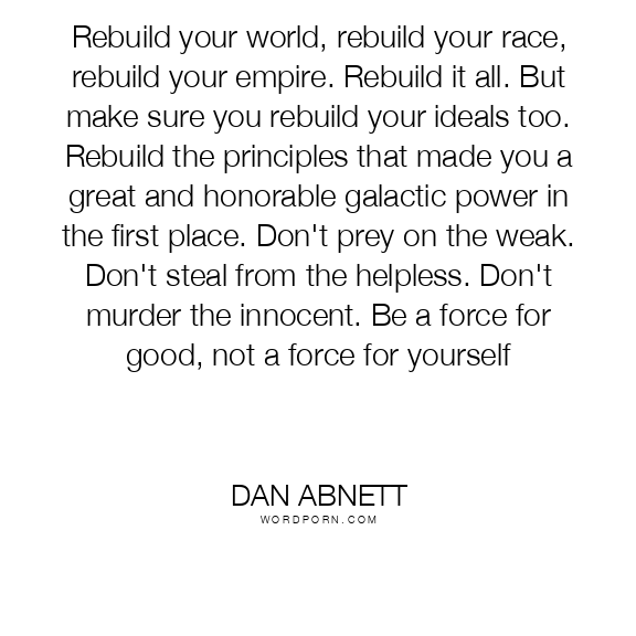 Dan Abnett quote. Rebuild your world, rebuild your race, rebuild your empire. Rebuild it all. But make sure you rebuild your ideals too. Rebuild the principles that made you a great and honorable galactic power in the first place. Don't prey on the weak. Don't steal from the helpless. Don't murder the innocent. Be a force for good, not a force for yourself