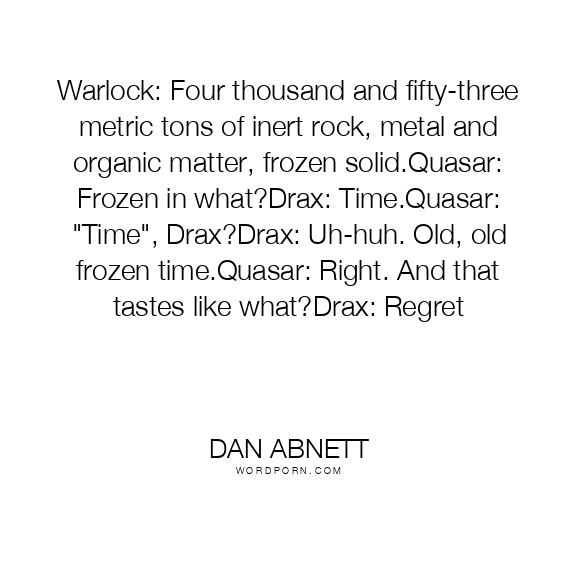Dan Abnett quote. Warlock: Four thousand and fifty-three metric tons of inert rock, metal and organic matter, frozen solid.Quasar: Frozen in what?Drax: Time.Quasar: