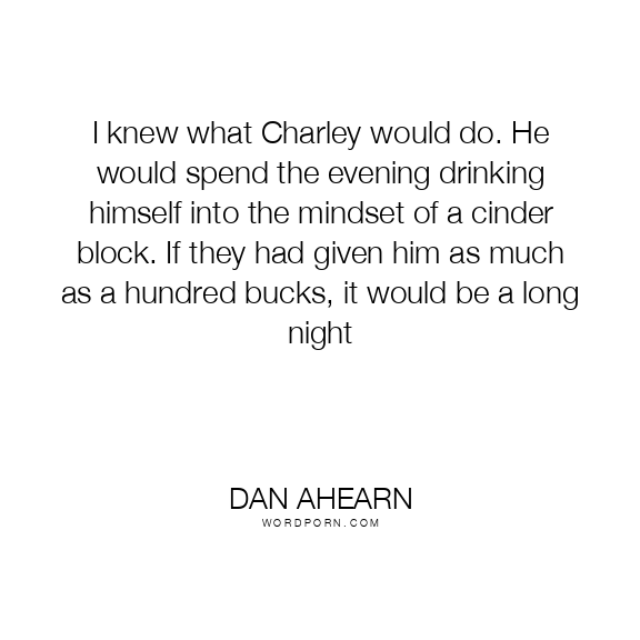 I knew what Charley would do. He would spend the evening drinking himself into the mindset of a cinder block. If they had given him as much as a hundred bucks, it would be a long night