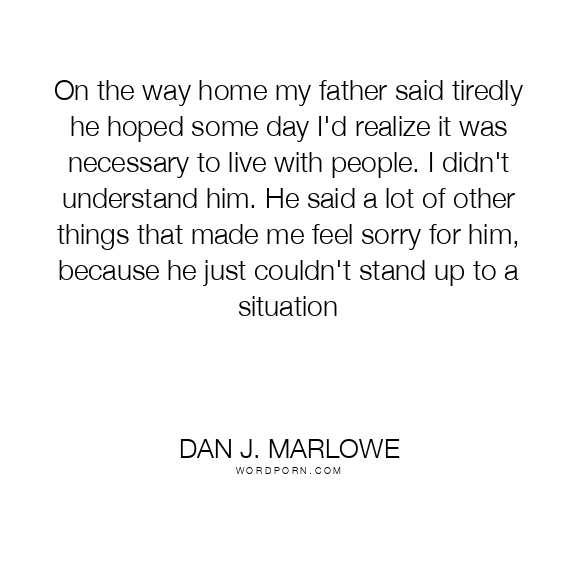 On the way home my father said tiredly he hoped some day I'd realize it was necessary to live with people. I didn't understand him. He said a lot of other things that made me feel sorry for him, because he just couldn't stand up to a situation